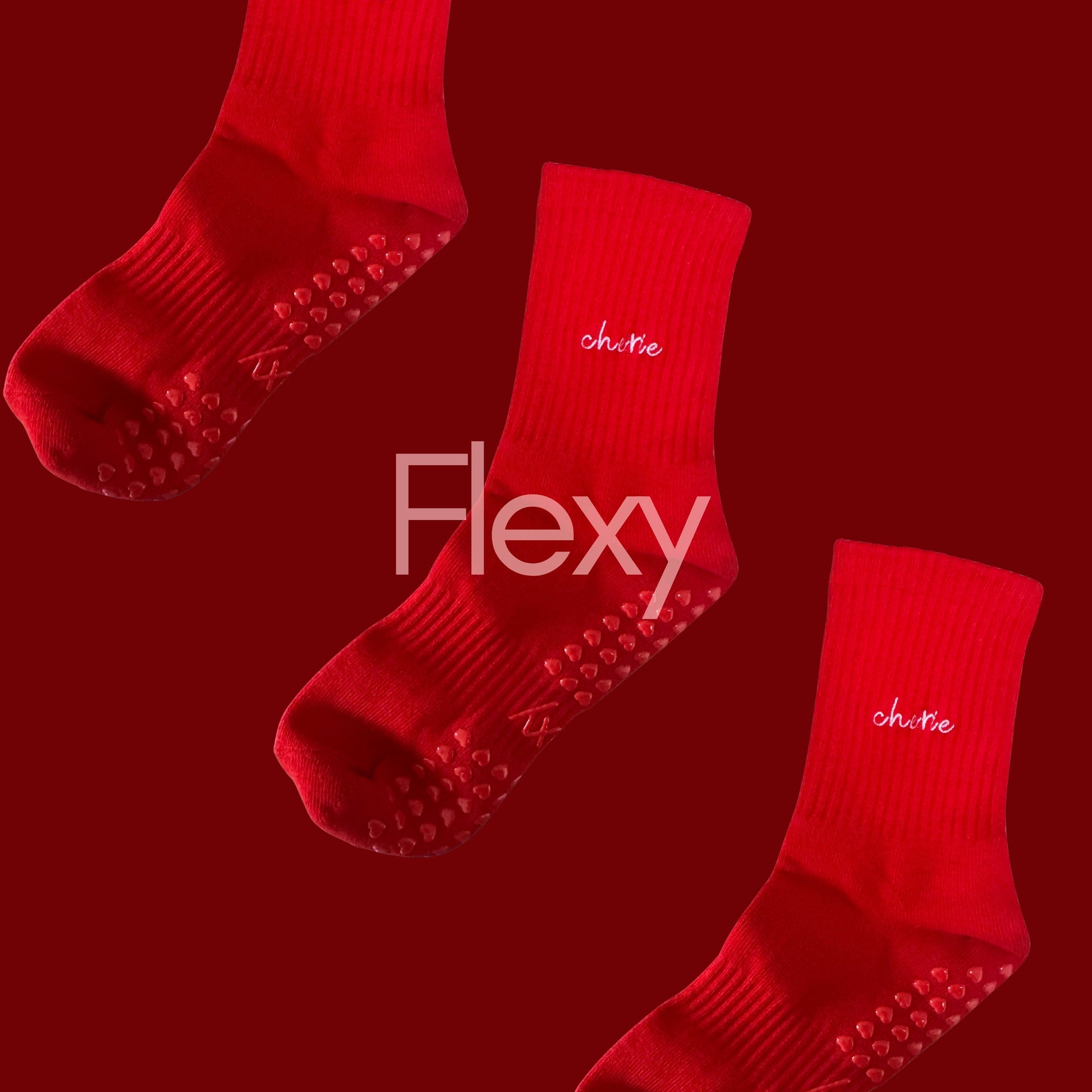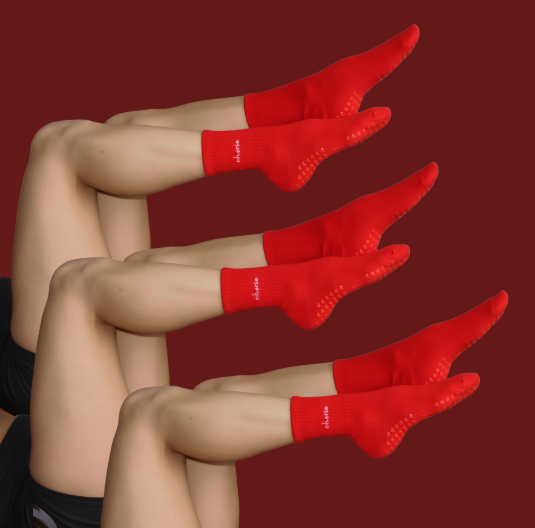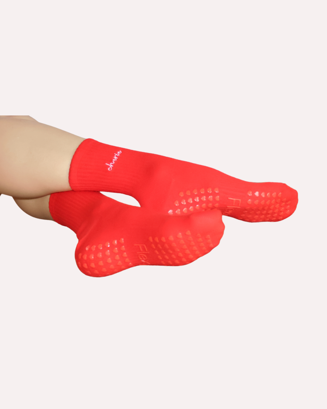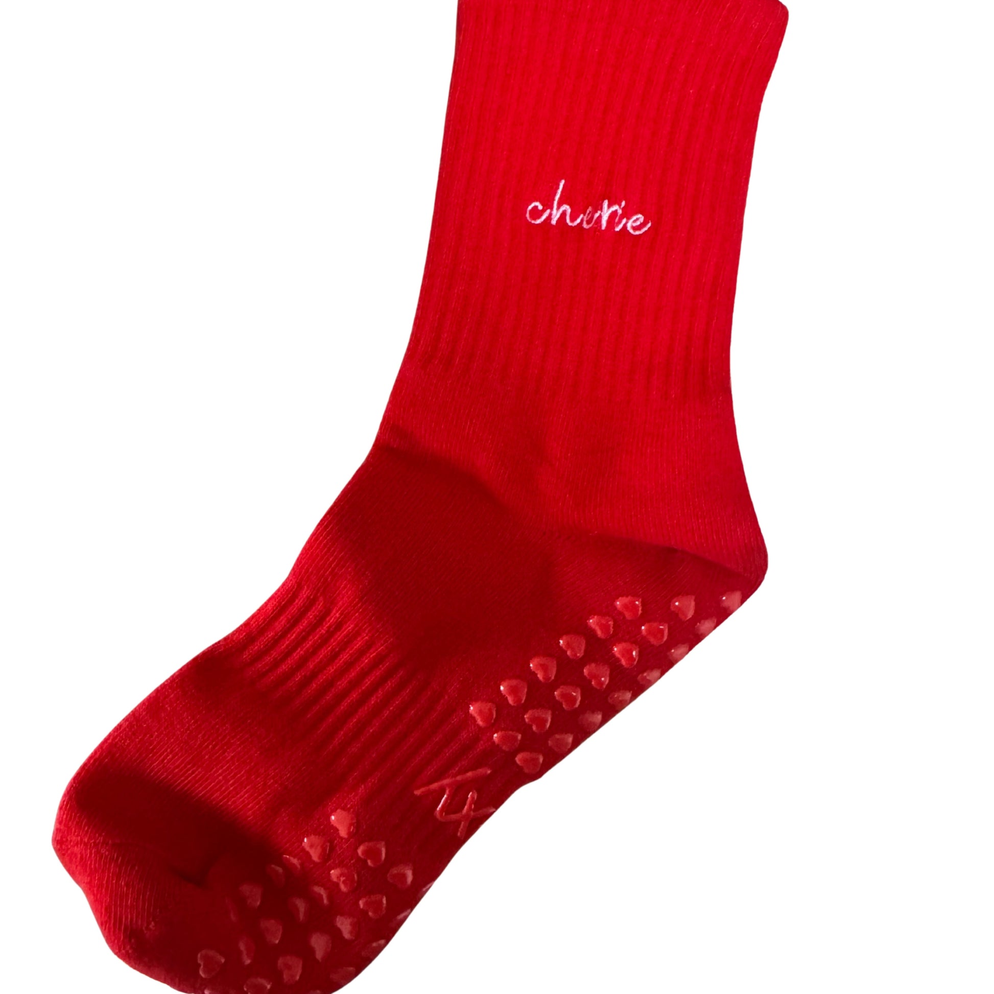 Cherie Grip Socks combine style with performance for your favorite studio workouts. Featuring embroidery on both sides, these red grip socks deliver reliable traction during pilates, barre, yoga, and Lagree classes. The heart-adorned design adds a touch of sophistication to your fitness routine, while the premium grip sole keeps you stable and secure on any studio floor. Designed for those who refuse to compromise on aesthetics or functionality.