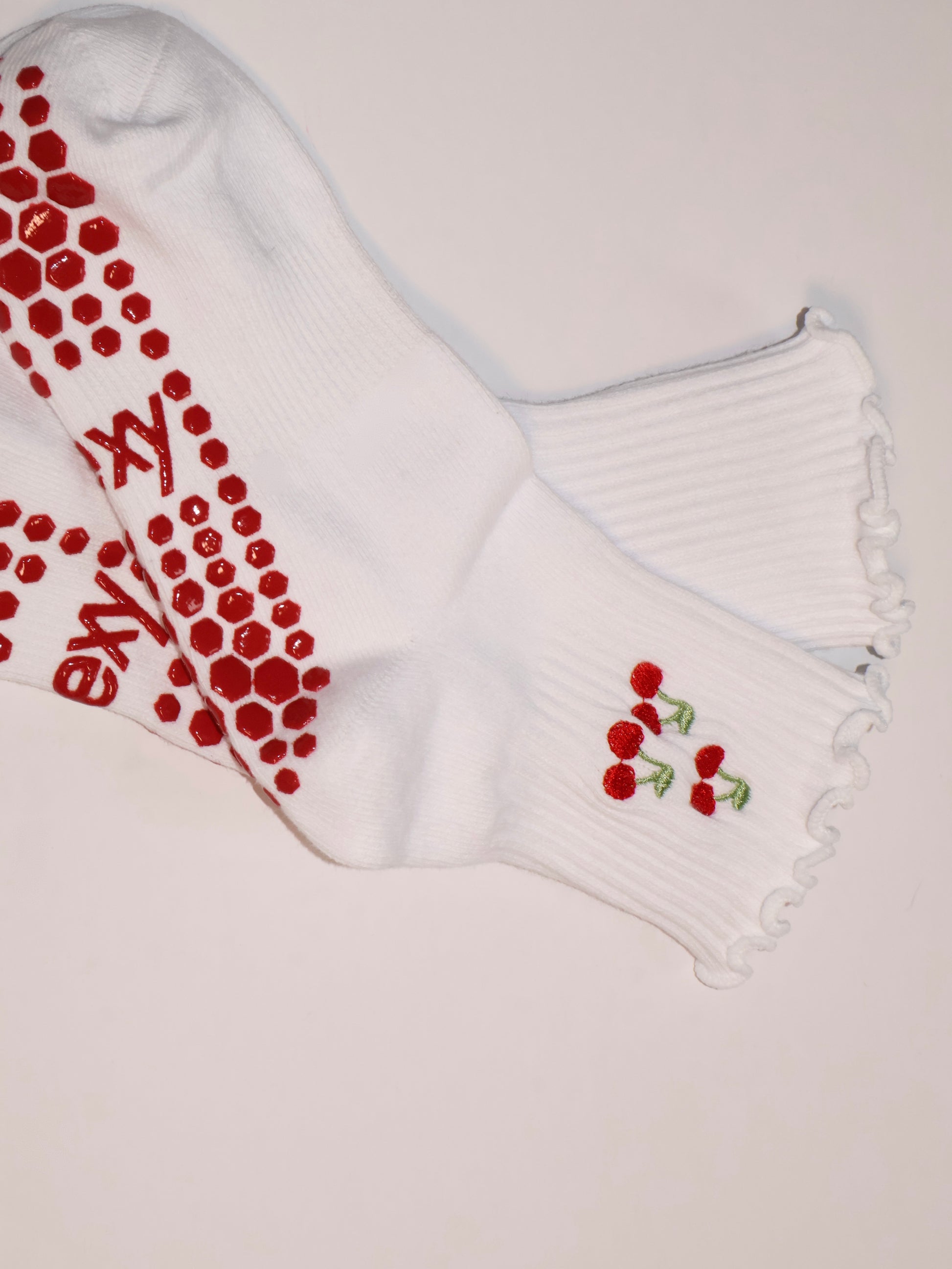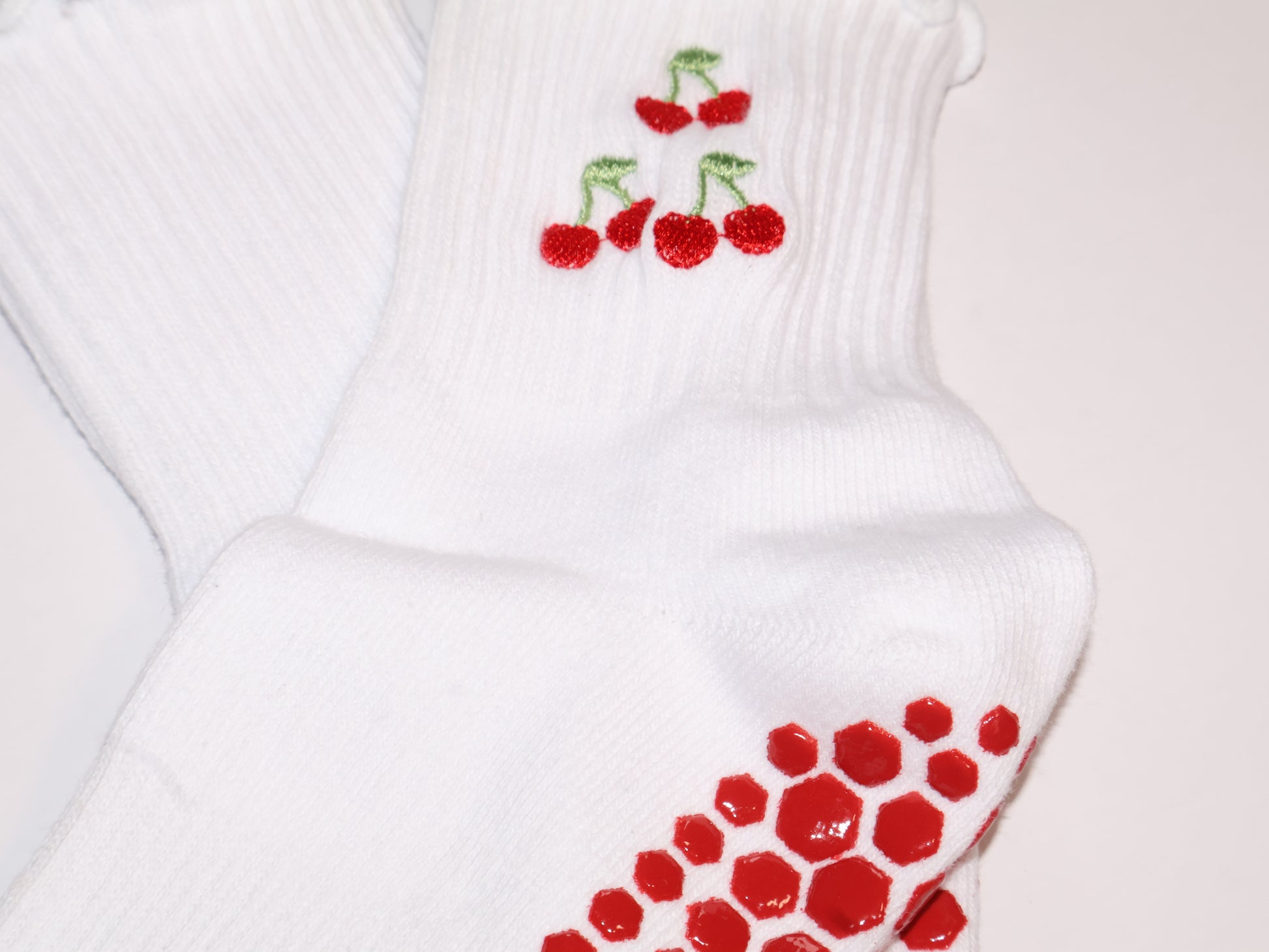 Flexy crew socks feature a delicate cherry motif and a charming ankle bow! These socks, made from high-quality materials, provide maximum comfort and stability during your Pilates practice. The airy fabric effortlessly wicks moisture away, keeping your feet fresh and dry. These socks are designed for a secure fit that stays put, making them suitable for Pilates enthusiasts of all skill levels.